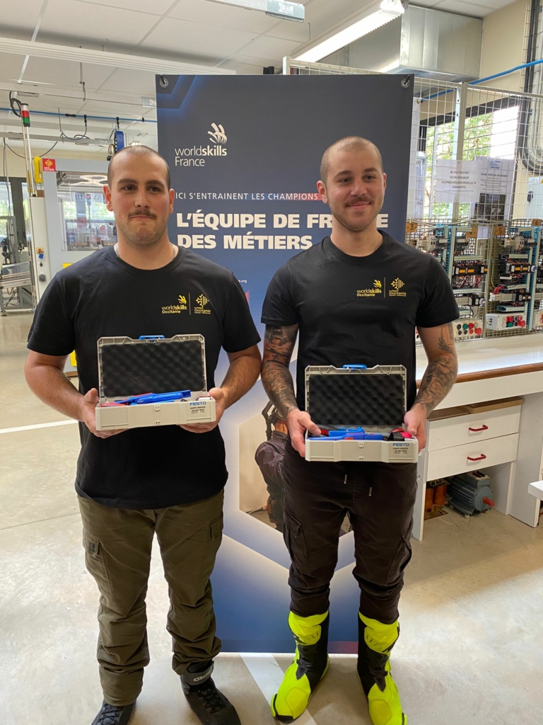 Nathan DUPRAT*et Sébastien CARCENAC, représentant la région Occitanie, se distinguent par leur détermination et leur talent. Nathan, ancien apprenti et compétiteur expérimenté, revient cette année avec un nouveau partenaire pour viser les plus hauts sommets. Pour les soutenir dans leur préparation, ils ont reçu chacun une mallette FESTO, outil incontournable de l’entraînement en mécatronique.